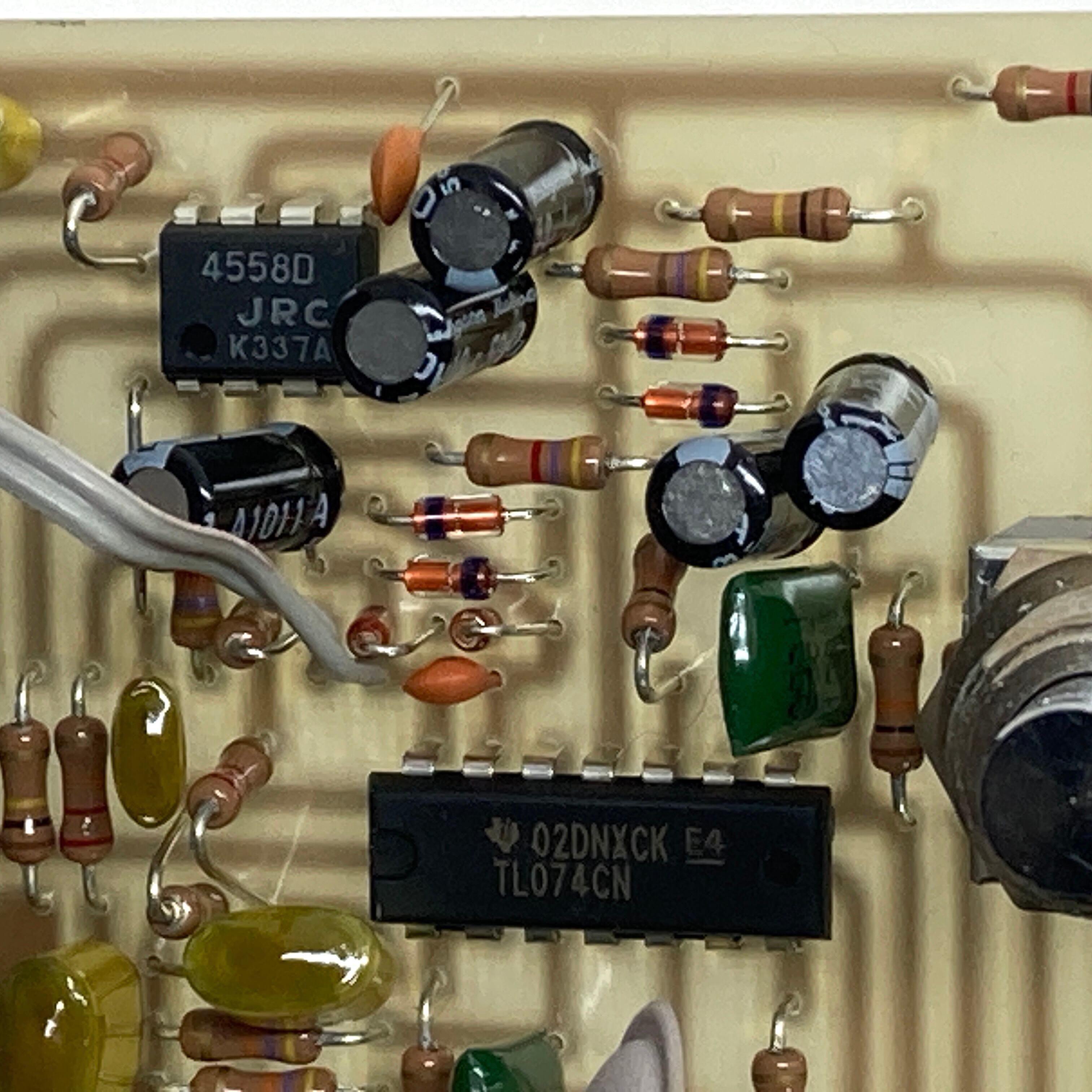 JRC4558とTL074の二つのオペアンプを搭載しており、ミッド重視の伝統的なオーバードライブ感(JRC4558)と、解像度やレンジを拡張する(TL074)を組み合わせ、低ノイズで広帯域な特性が得られる設計を狙っていると思われます。